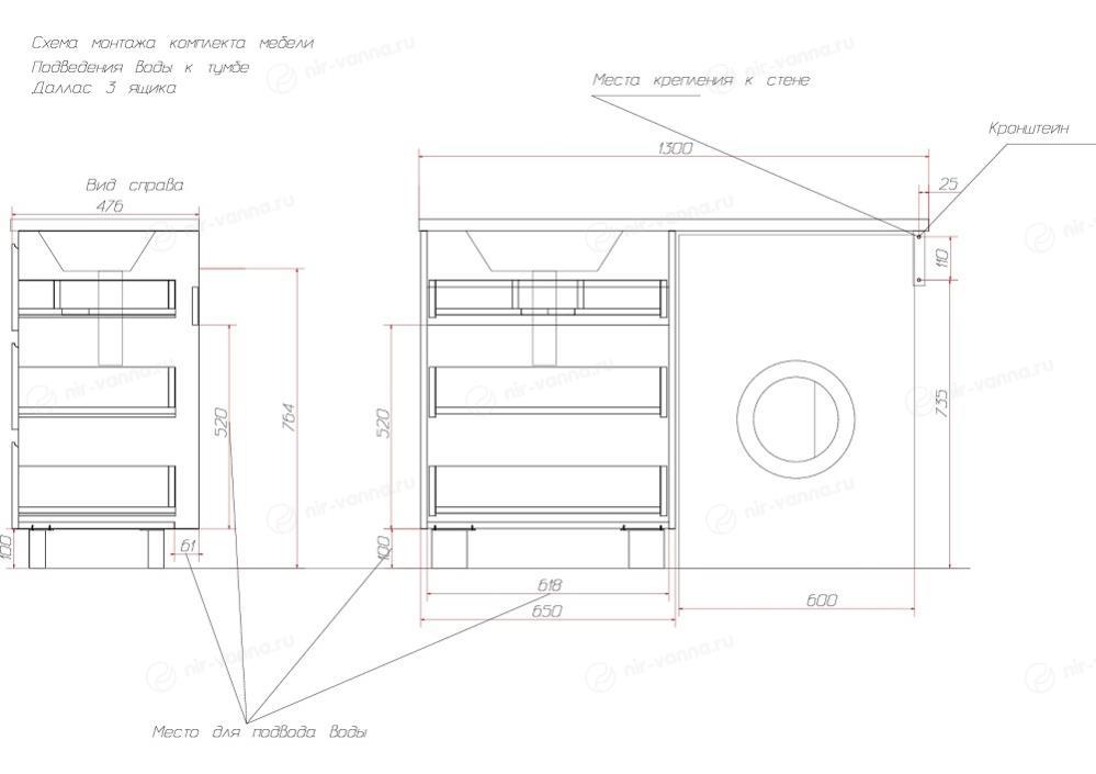 Тумба с раковиной Эстет Dallas Luxe 130 белая/на выбор L под стиральную машину 3 ящика