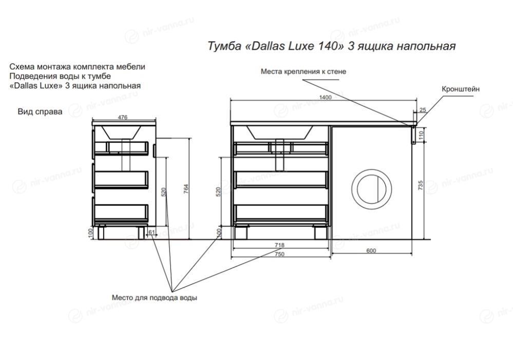 Тумба с раковиной Эстет Dallas Luxe 140 белая/на выбор R под стиральную машину 3 ящика