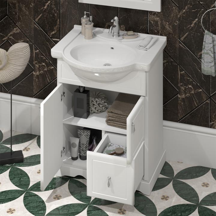 прямоугольная тумба с раковиной Opadiris сделает ванную комнату уютной и поможет рационально организовать пространство. Корпус мебели изготовлен из ЛДСП — сертифицированного, безопасного материала. При габаритах 56 см.х45 см конструкция не выглядит массивной, но благодаря удобным полкам вмещает много вещей. Высота 88 см позволяет удобно доставать до раковины. Фасады тумбы выполнены из Массив бука. Их (белый) и элегантная форма гармонично сочетаются между собой. За поверхностями легко ухаживать. Их рекомендуется протирать мягкой губкой или тканевой салфеткой с нейтральным моющим средством без абразивных частиц.