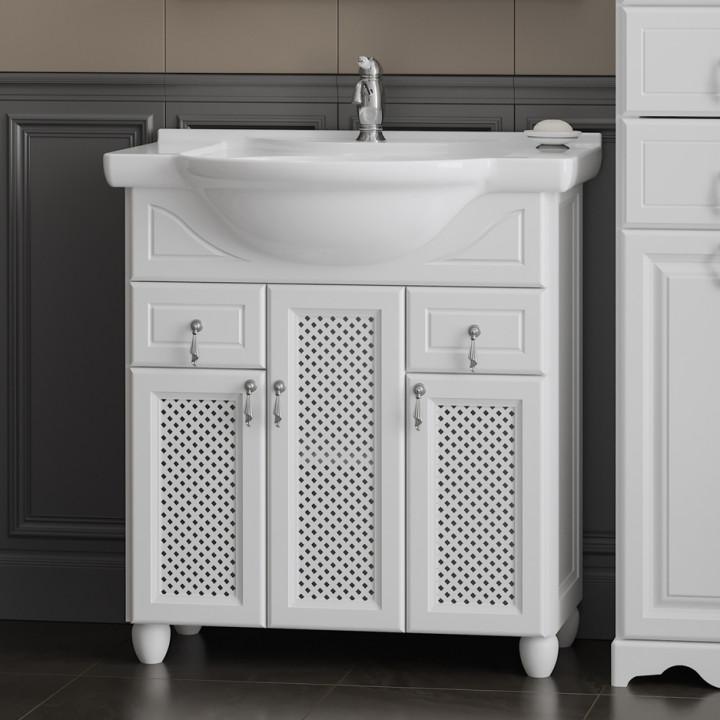 прямоугольная тумба с раковиной Opadiris сделает ванную комнату уютной и поможет рационально организовать пространство. Корпус мебели изготовлен из ЛДСП — сертифицированного, безопасного материала. При габаритах 77 см.х51 см конструкция не выглядит массивной, но благодаря удобным полкам вмещает много вещей. Высота 89 см позволяет удобно доставать до раковины. Фасады тумбы выполнены из Массив бука. Их (белый) и элегантная форма гармонично сочетаются между собой. За поверхностями легко ухаживать. Их рекомендуется протирать мягкой губкой или тканевой салфеткой с нейтральным моющим средством без абразивных частиц.