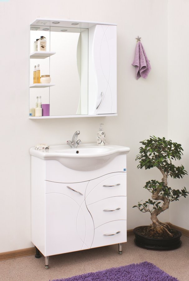 прямоугольная тумба с раковиной Style Line сделает ванную комнату уютной и поможет рационально организовать пространство. Корпус мебели изготовлен из ДСП — сертифицированного, безопасного материала. При габаритах 75.5 см.х50.5 см конструкция не выглядит массивной, но благодаря удобным полкам вмещает много вещей. Высота 85 см позволяет удобно доставать до раковины. Фасады тумбы выполнены из МДФ. Их (белый глянец) и элегантная форма гармонично сочетаются между собой. За поверхностями легко ухаживать. Их рекомендуется протирать мягкой губкой или тканевой салфеткой с нейтральным моющим средством без абразивных частиц.