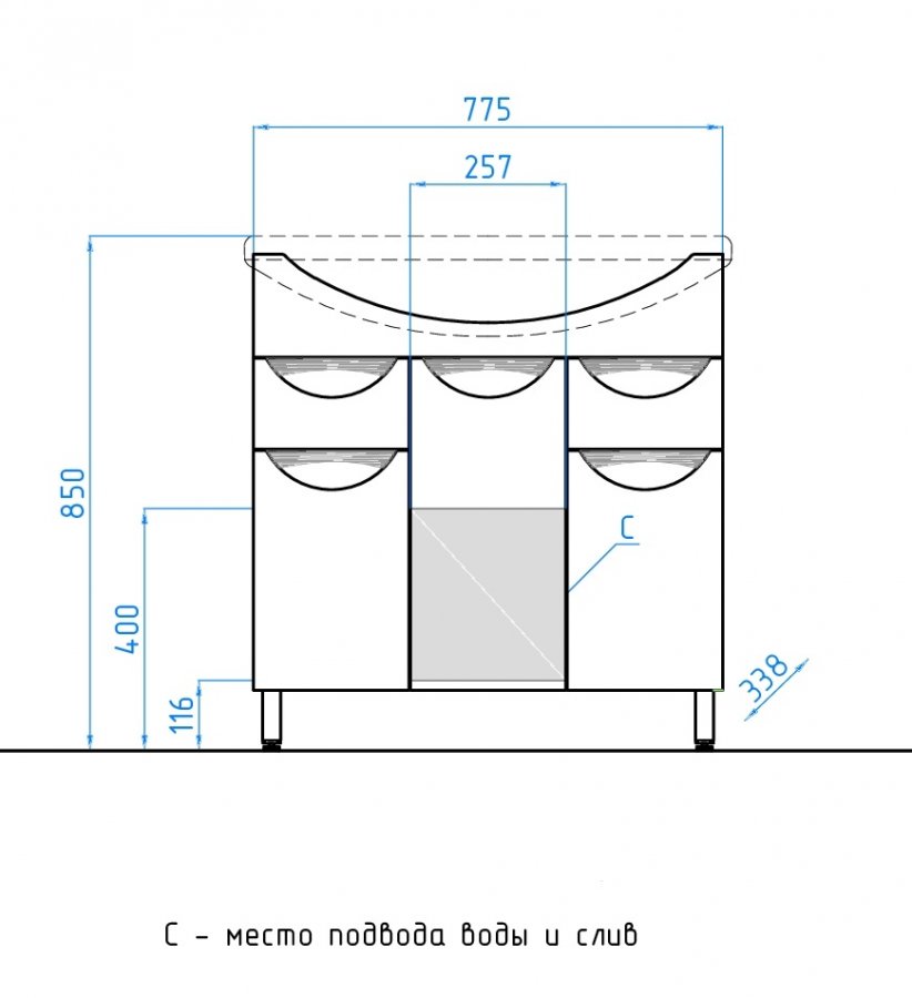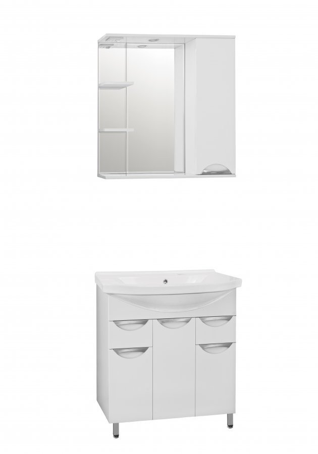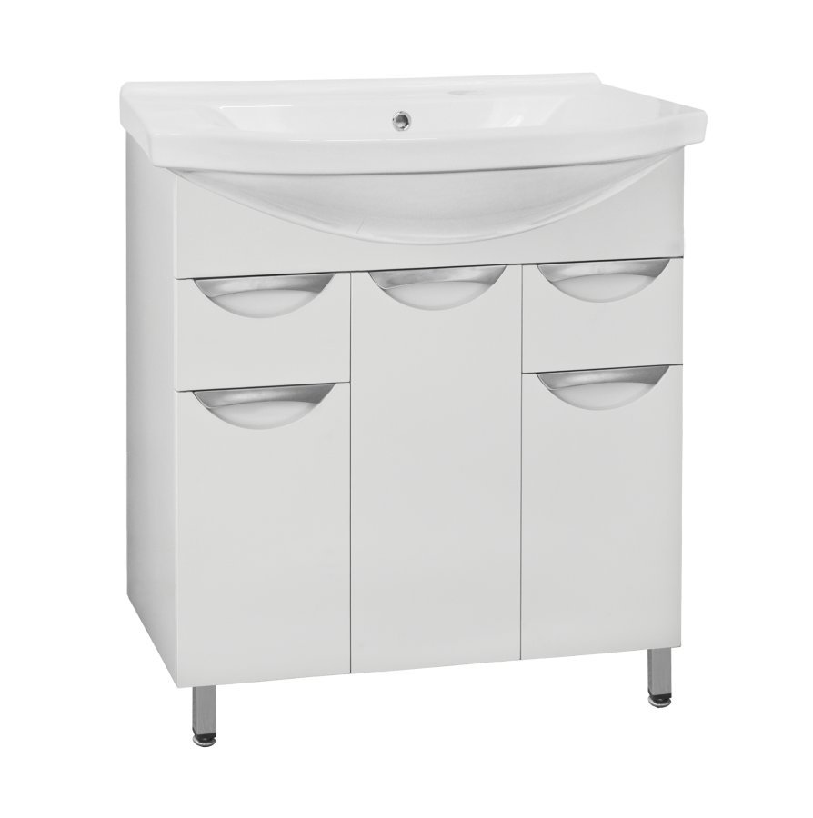 прямоугольная тумба с раковиной Style Line сделает ванную комнату уютной и поможет рационально организовать пространство. Корпус мебели изготовлен из ДСП — сертифицированного, безопасного материала. При габаритах 80 см.х53 см конструкция не выглядит массивной, но благодаря удобным полкам вмещает много вещей. Высота 85 см позволяет удобно доставать до раковины. Фасады тумбы выполнены из МДФ. Их (белый глянец) и элегантная форма гармонично сочетаются между собой. За поверхностями легко ухаживать. Их рекомендуется протирать мягкой губкой или тканевой салфеткой с нейтральным моющим средством без абразивных частиц.