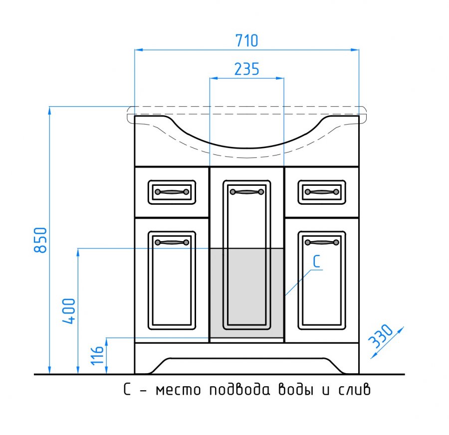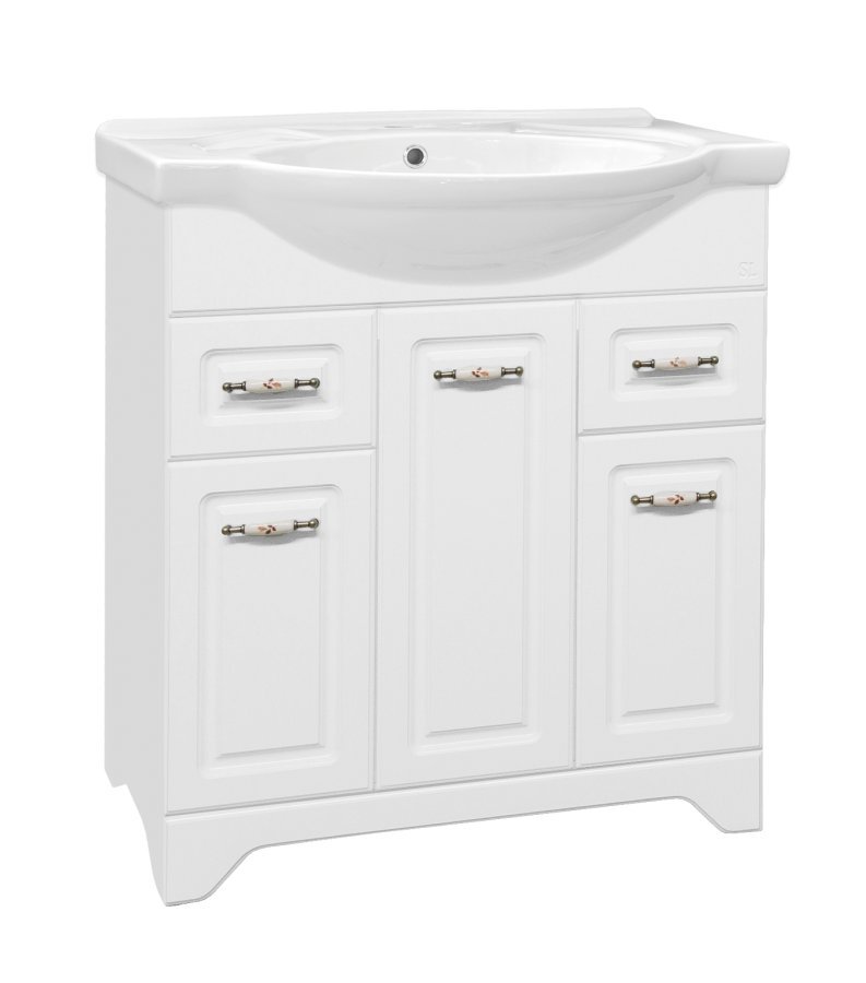 прямоугольная тумба с раковиной Style Line сделает ванную комнату уютной и поможет рационально организовать пространство. Корпус мебели изготовлен из МДФ — сертифицированного, безопасного материала. При габаритах 76 см.х51 см конструкция не выглядит массивной, но благодаря удобным полкам вмещает много вещей. Высота 85 см позволяет удобно доставать до раковины. Фасады тумбы выполнены из МДФ. Их (белый глянец) и элегантная форма гармонично сочетаются между собой. За поверхностями легко ухаживать. Их рекомендуется протирать мягкой губкой или тканевой салфеткой с нейтральным моющим средством без абразивных частиц.