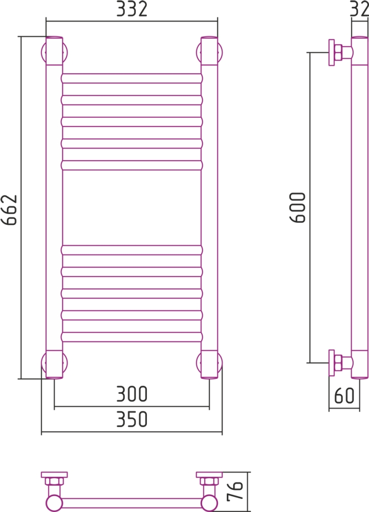 Полотенцесушитель крепится на стену. Габариты 66.2х35 см. см позволяют выполнить установку как вместо штатного змеевика, так и в любом свободном месте санузла.