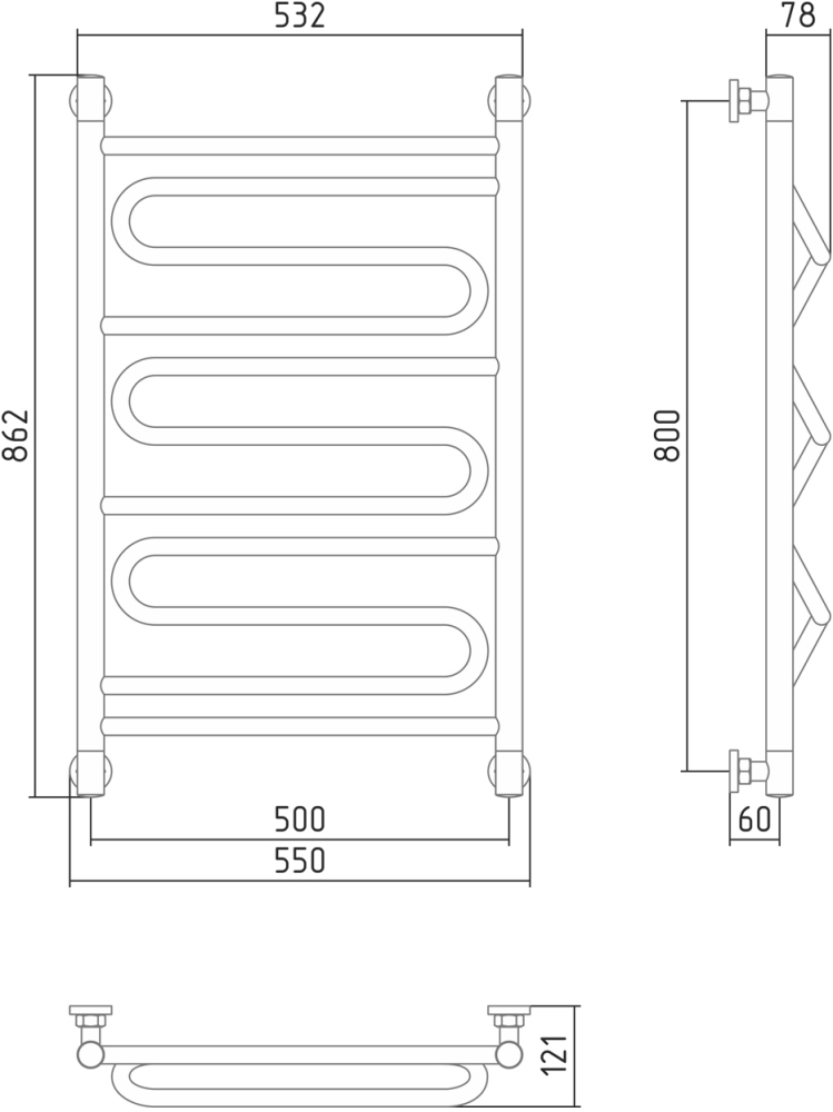 Полотенцесушитель крепится на стену. Габариты 86.2х55 см. см позволяют выполнить установку как вместо штатного змеевика, так и в любом свободном месте санузла.