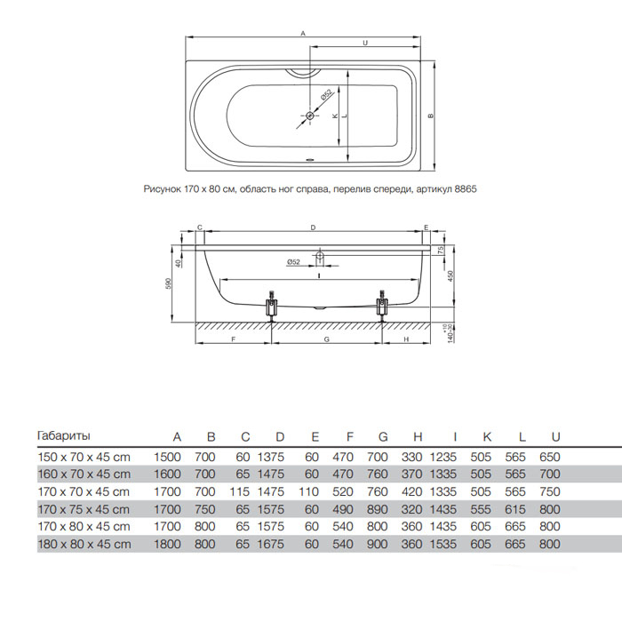 Ванна стальная Bette Ocean 180*80*45 с шумоизоляцией, перелив спереди