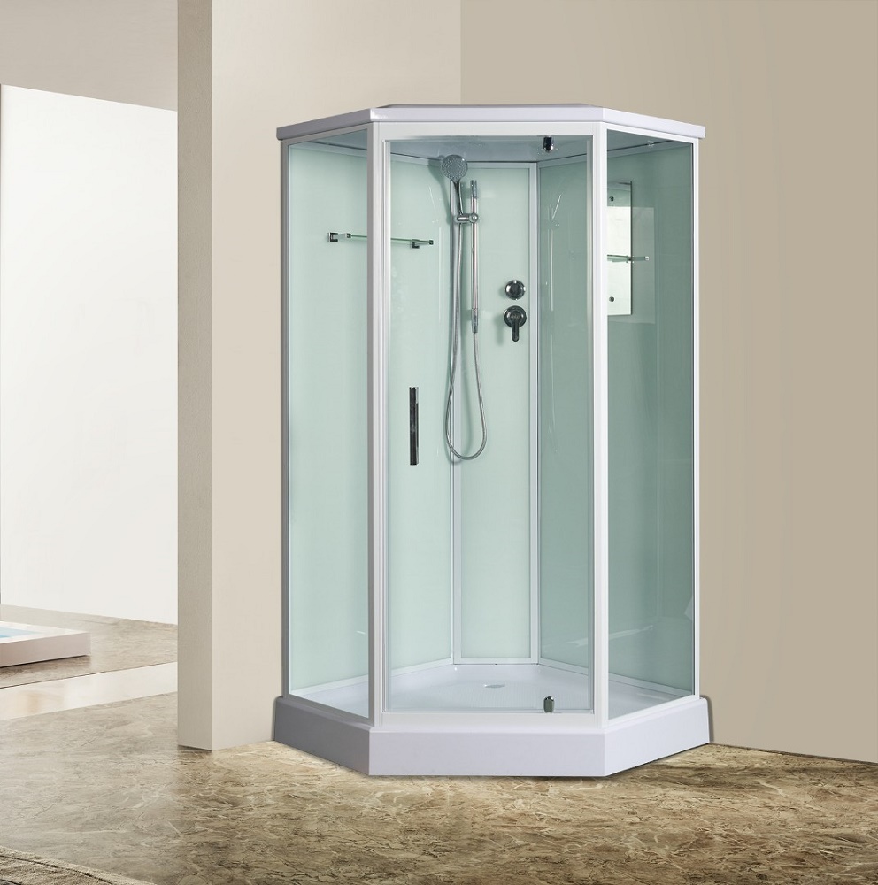 Душевая кабина River 90 пятиугольная проста и удобна в использовании. Она герметична, не позволяет воде попасть на пол. Ее можно установить в помещении с любой отделкой. Душевая кабина представляет собой готовое решение: стойки, смесители, лейка для душа идут в комплекте. После установки устройства удается уменьшить расход воды. Обратите внимание: размер кабины рассчитывается по внешним элементам. Внутреннее пространство будет меньше. экструзионный акрил (ПММА/АБС) — основной материал сантехнического изделия — отличается надежностью, презентабельным внешним видом. белый цвет душевой кабины станет беспроигрышным вариантом для санузла, выполненном в любом стилевом решении (от классики до модерна).