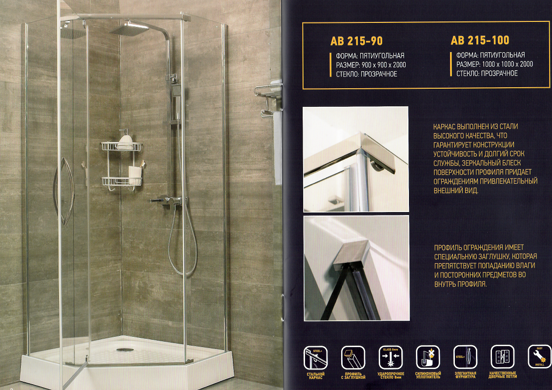 Душевое ограждение Alex Baitler 100 пятиугольная поможет благоустроить ванную комнату. Такой вариант позволит максимально грамотно использовать пространство в небольшом санузле. Для ограждения душевой понадобится одна-две перегородки.