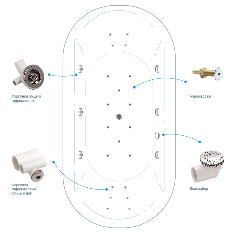SPA-отдых дома? Это реально! Выбирая гидромассажную систему, присмотритесь к варианту SPA. Включает все виды массажа. Это комплект из 6 боковых форсунок гидромассажа, 10 аэроджетов на дне ванны, а также форсунок для точечного воздействия: 6 для спины и4 для ног. Позволяет качественно отдыхать, проводить профилактику целлюлита и поддерживать мышцы в тонусе. Полезно при стрессе и перенапряжении.