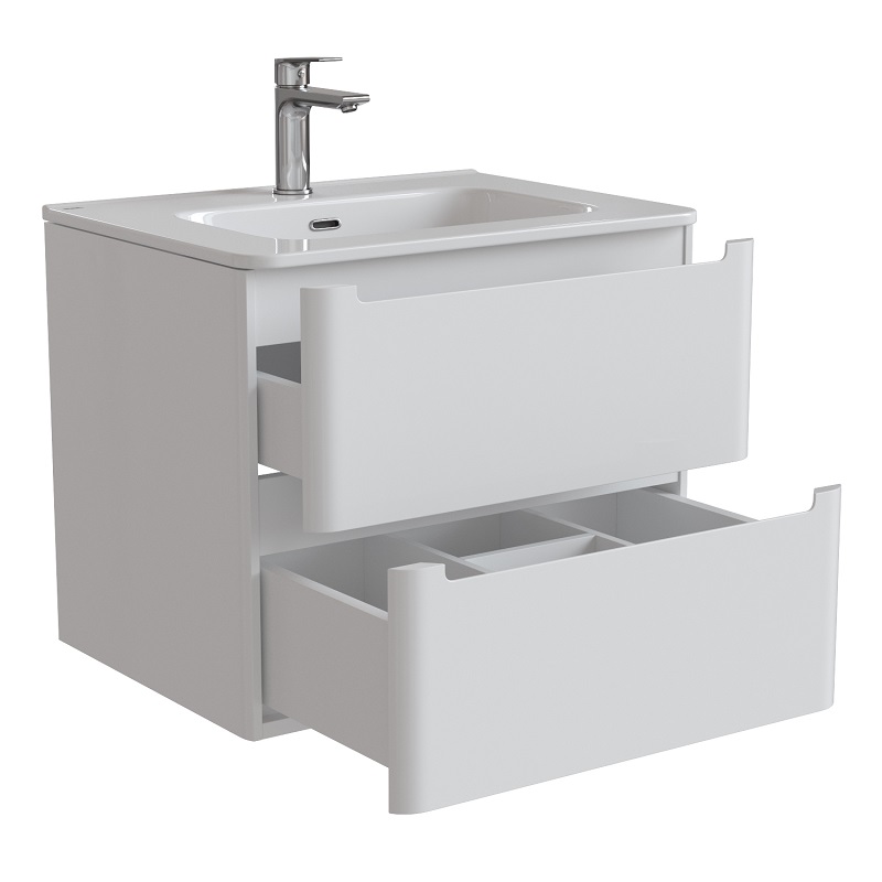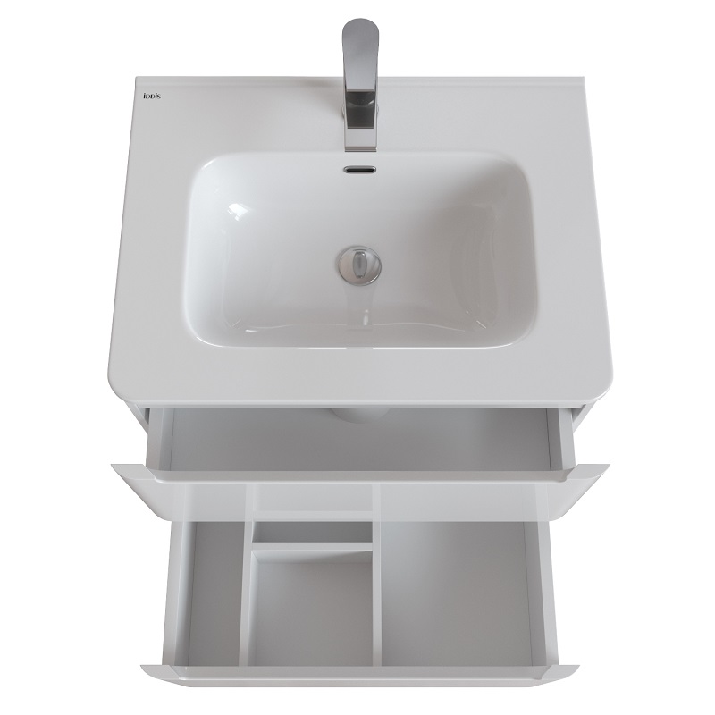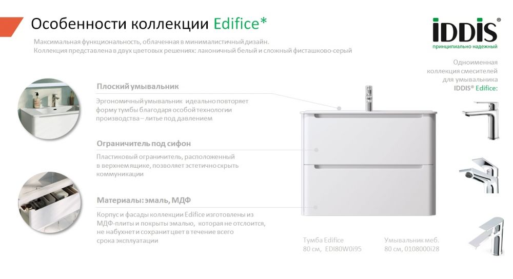 прямоугольная тумба с раковиной Iddis сделает ванную комнату уютной и поможет рационально организовать пространство. Корпус мебели изготовлен из МДФ — сертифицированного, безопасного материала. При габаритах 60 см.х47 см конструкция не выглядит массивной, но благодаря удобным полкам вмещает много вещей. Высота 50 см позволяет удобно доставать до раковины. Фасады тумбы выполнены из МДФ. Их (белый) и элегантная форма гармонично сочетаются между собой. За поверхностями легко ухаживать. Их рекомендуется протирать мягкой губкой или тканевой салфеткой с нейтральным моющим средством без абразивных частиц.