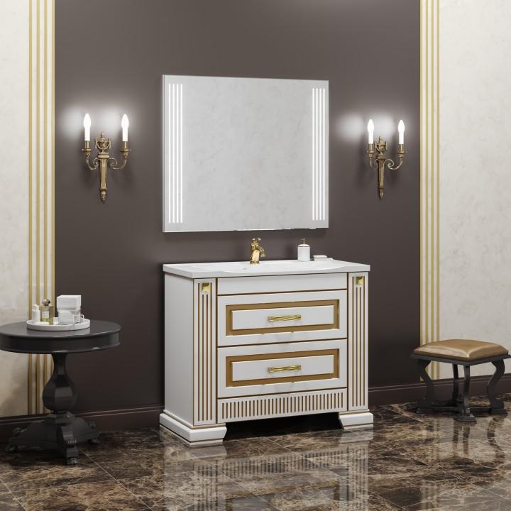 прямоугольная тумба с раковиной Opadiris сделает ванную комнату уютной и поможет рационально организовать пространство. Корпус мебели изготовлен из ЛДСП — сертифицированного, безопасного материала. При габаритах 105 см.х45 см конструкция не выглядит массивной, но благодаря удобным полкам вмещает много вещей. Высота 85.5 см позволяет удобно доставать до раковины. Фасады тумбы выполнены из МДФ. Их (белый глянец с золотой патиной) и элегантная форма гармонично сочетаются между собой. За поверхностями легко ухаживать. Их рекомендуется протирать мягкой губкой или тканевой салфеткой с нейтральным моющим средством без абразивных частиц.