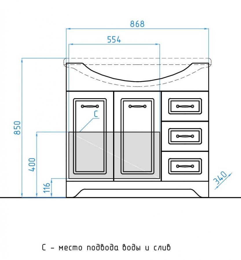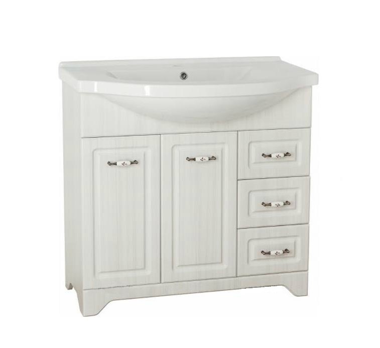 прямоугольная тумба с раковиной Style Line сделает ванную комнату уютной и поможет рационально организовать пространство. Корпус мебели изготовлен из ДСП — сертифицированного, безопасного материала. При габаритах 90.5 см.х52 см конструкция не выглядит массивной, но благодаря удобным полкам вмещает много вещей. Высота 85 см позволяет удобно доставать до раковины. Фасады тумбы выполнены из ЛДСП. Их (рельеф пастель) и элегантная форма гармонично сочетаются между собой. За поверхностями легко ухаживать. Их рекомендуется протирать мягкой губкой или тканевой салфеткой с нейтральным моющим средством без абразивных частиц.