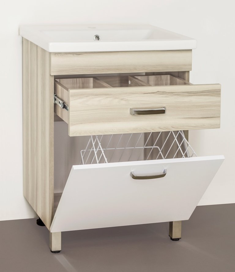 прямоугольная тумба с раковиной Style Line сделает ванную комнату уютной и поможет рационально организовать пространство. Корпус мебели изготовлен из ДСП — сертифицированного, безопасного материала. При габаритах 60 см.х45 см конструкция не выглядит массивной, но благодаря удобным полкам вмещает много вещей. Высота 85 см позволяет удобно доставать до раковины. Фасады тумбы выполнены из ЛДСП. Их (древесина/белый глянец) и элегантная форма гармонично сочетаются между собой. За поверхностями легко ухаживать. Их рекомендуется протирать мягкой губкой или тканевой салфеткой с нейтральным моющим средством без абразивных частиц.