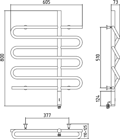 Полотенцесушитель крепится на стену. Габариты 80х60.5 см. см позволяют выполнить установку как вместо штатного змеевика, так и в любом свободном месте санузла.