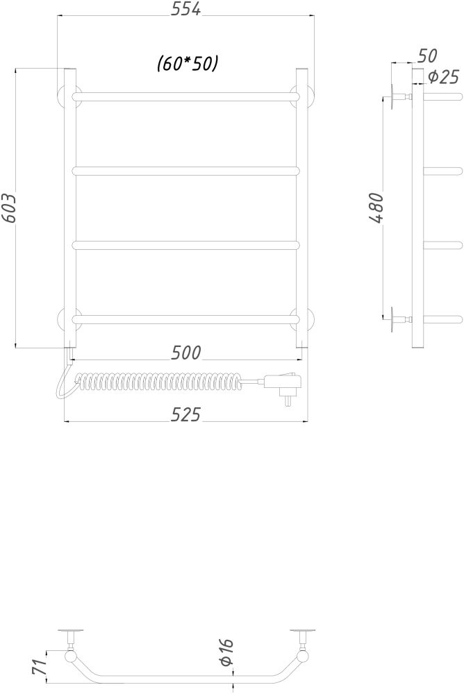 Полотенцесушитель крепится на стену. Габариты 60.3х55.4 см. см позволяют выполнить установку как вместо штатного змеевика, так и в любом свободном месте санузла.