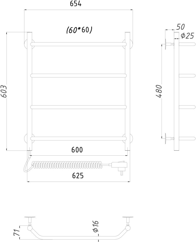 Полотенцесушитель крепится на стену. Габариты 60.3х65.400000000000006 см. см позволяют выполнить установку как вместо штатного змеевика, так и в любом свободном месте санузла.