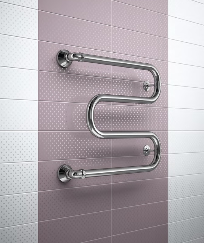 Полотенцесушитель крепится на стену. Габариты 50х50 см. см позволяют выполнить установку как вместо штатного змеевика, так и в любом свободном месте санузла.