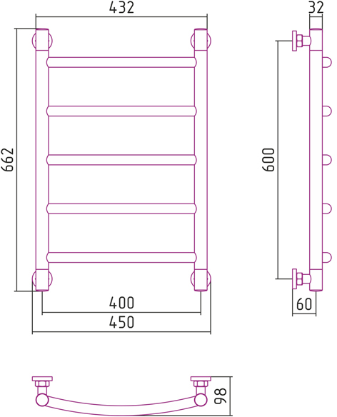 Полотенцесушитель крепится на стену. Габариты 66.2х45 см. см позволяют выполнить установку как вместо штатного змеевика, так и в любом свободном месте санузла.