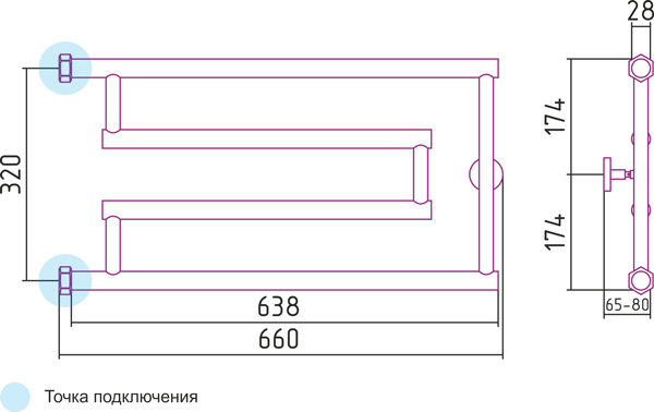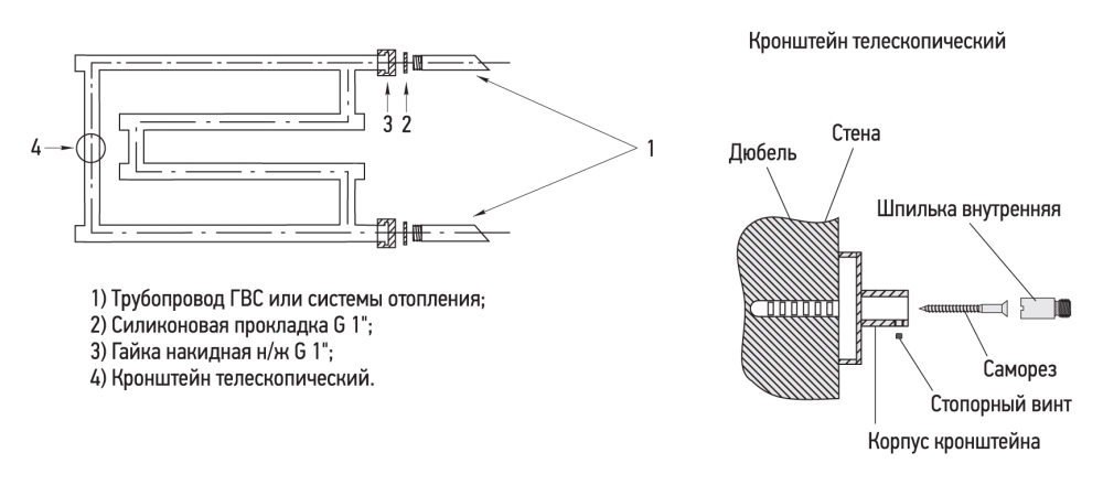 Полотенцесушитель крепится на стену. Габариты 34.799999999999997х66 см. см позволяют выполнить установку как вместо штатного змеевика, так и в любом свободном месте санузла.
