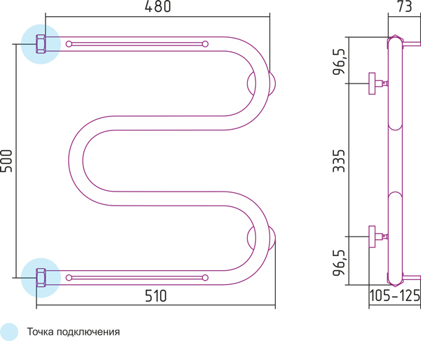 Полотенцесушитель крепится на стену. Габариты 52.8х51 см. см позволяют выполнить установку как вместо штатного змеевика, так и в любом свободном месте санузла.