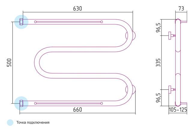 Полотенцесушитель крепится на стену. Габариты 52.8х66 см. см позволяют выполнить установку как вместо штатного змеевика, так и в любом свободном месте санузла.