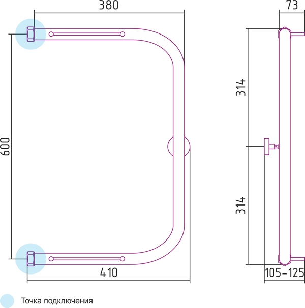 Полотенцесушитель крепится на стену. Габариты 62.8х41 см. см позволяют выполнить установку как вместо штатного змеевика, так и в любом свободном месте санузла.