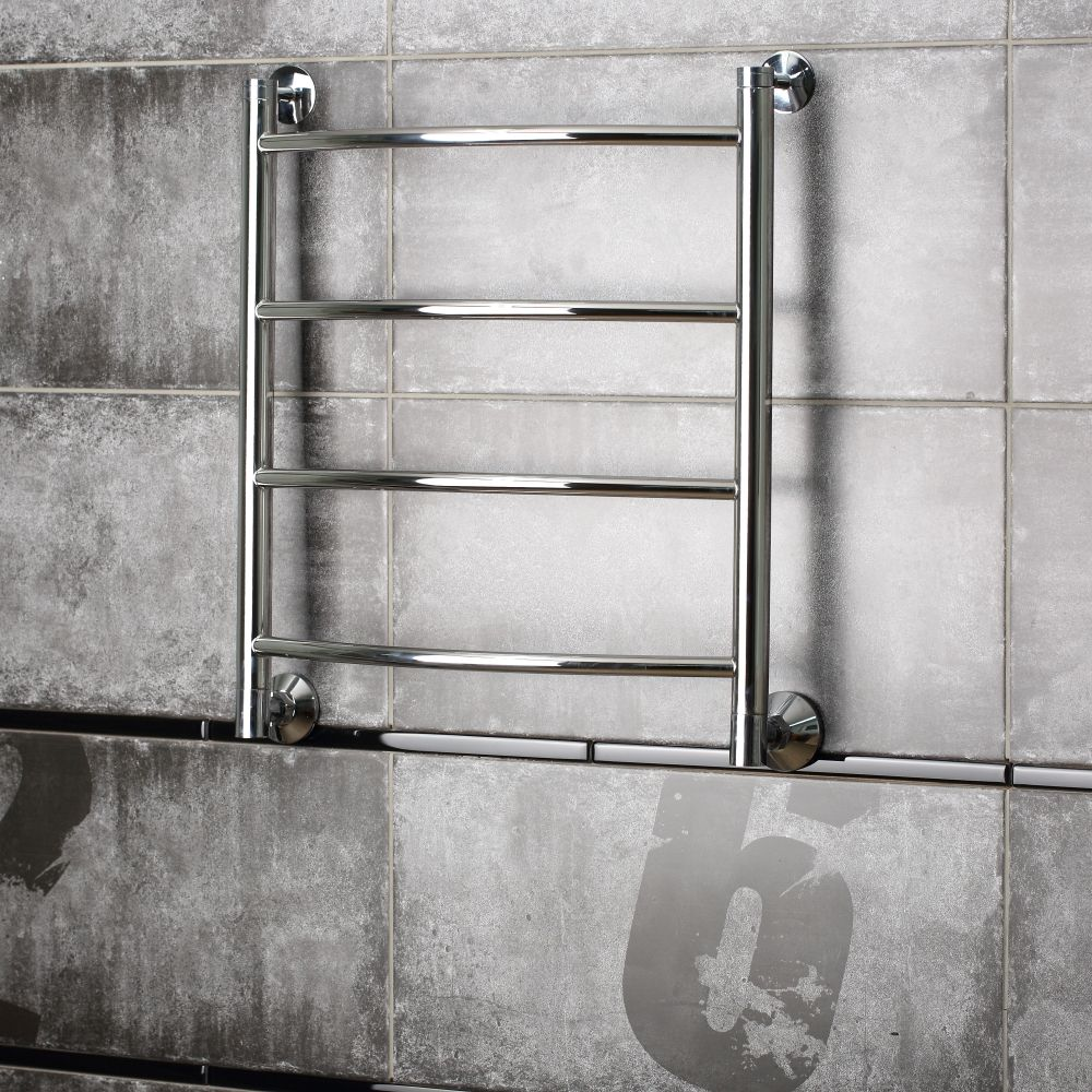 Полотенцесушитель крепится на стену. Габариты 60.6х45.4 см. см позволяют выполнить установку как вместо штатного змеевика, так и в любом свободном месте санузла.