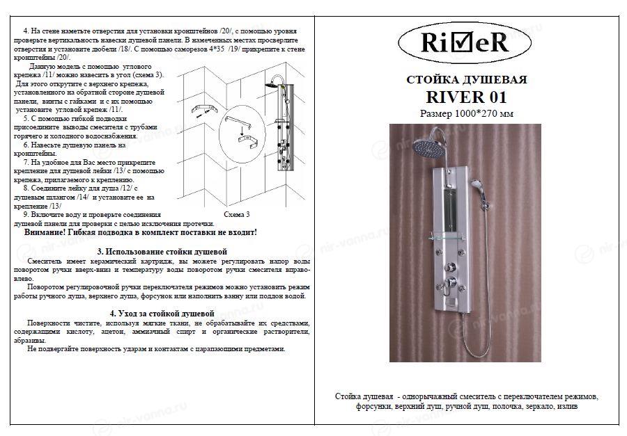 В 2007-ом году бренд River начал активно налаживать производство сантехнической продукции и договариваться о поставках в различные страны по всему миру. В Россию компания пришла в 2010-ом году и довольно быстро зарекомендовала себя. Основной ассортимент River - душевые кабины, которые продаются по выгодной цене. Их производством организация занялась в 2012-ом году и практически сразу добилась существенных успехов в плане продаж. Все производство осуществляется с учетом современных стандартов качества, используются экологичные материалы.