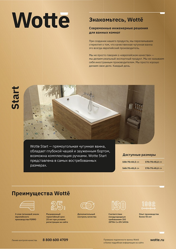 Чугунная ванна Wotte 150 прямоугольная — это прочность, надежность и долговечность. Она не трескается, не царапается, не боится коррозии. Ванна из чугуна длительное время держит тепло, поэтому отпадает необходимость время от времени подливать горячую воду. Чугун обладает хорошей шумоизоляцией: всплески воды будут не слышны. Чтобы сохранить белый цвет эмалевого покрытия, можно использовать любую бытовую химию.