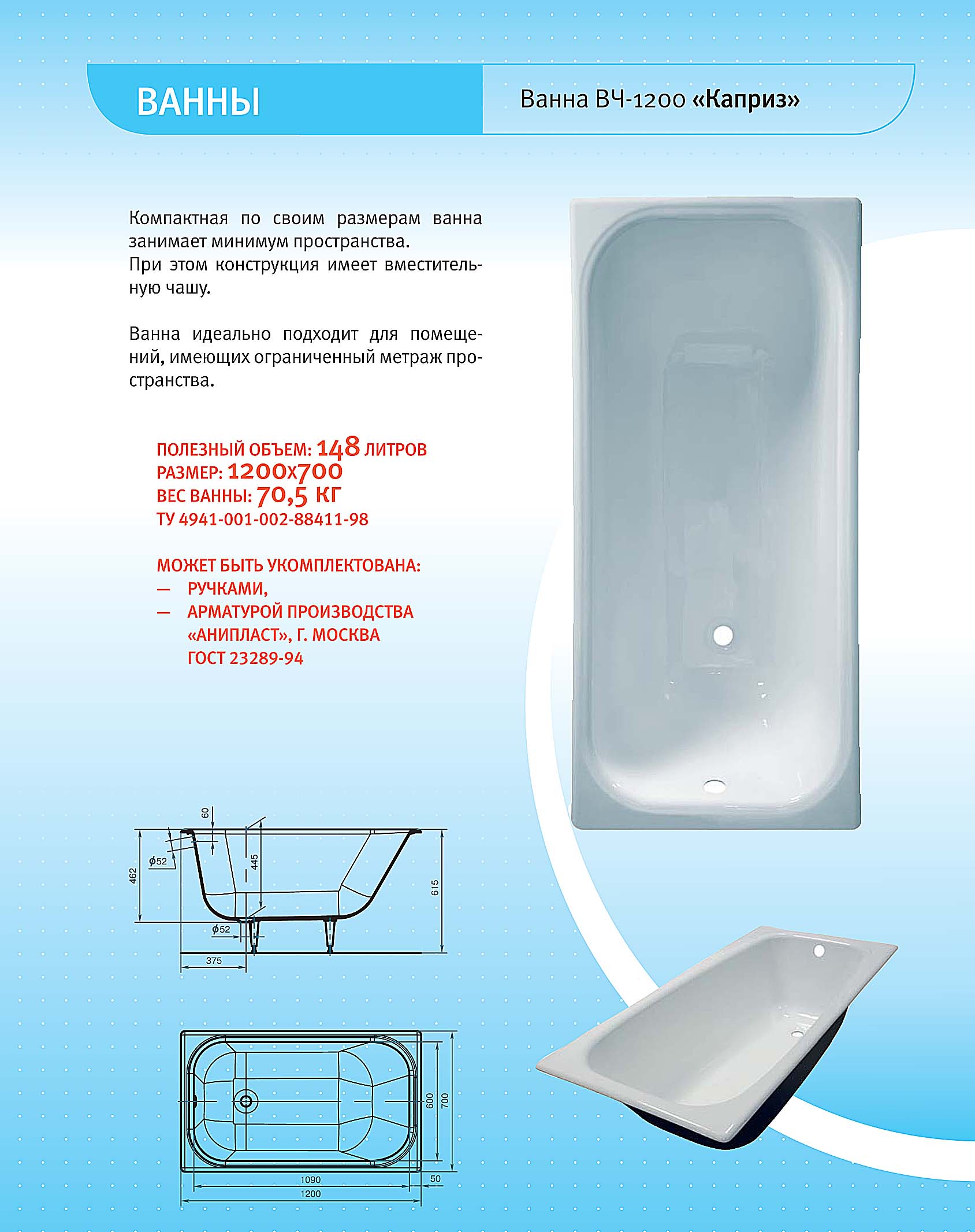 Чугунная ванна Универсал 120 прямоугольная — это прочность, надежность и долговечность. Она не трескается, не царапается, не боится коррозии. Ванна из чугуна длительное время держит тепло, поэтому отпадает необходимость время от времени подливать горячую воду. Чугун обладает хорошей шумоизоляцией: всплески воды будут не слышны. Чтобы сохранить белый цвет эмалевого покрытия, можно использовать любую бытовую химию.