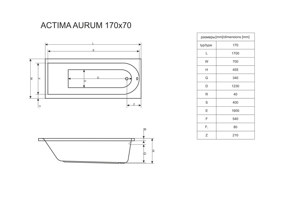 Акриловая ванна Excellent Actima Aurum 170*70 без слива-перелива