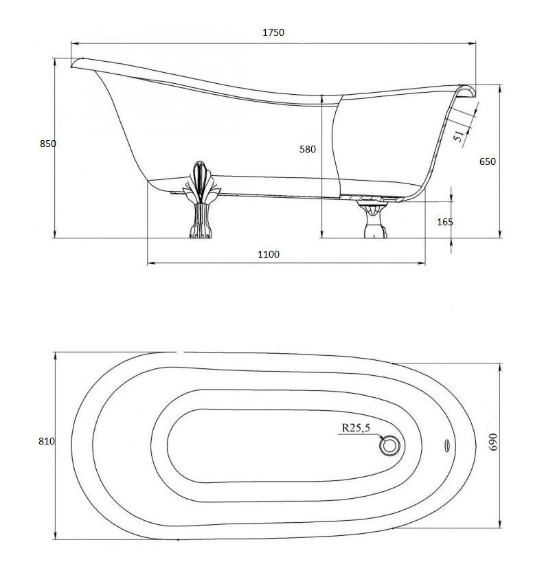 Ванна из искусственного камня Castone Даллас King Size 175*85 ножки белые
