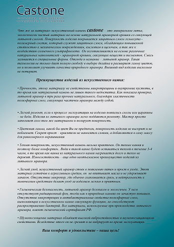 Ванна из искусственного камня Castone 190 овальная подкупает пользователя отличными эксплуатационными свойствами, показателями долговечности и прочности. Ванны отличаются следующими преимуществами: огромный ассортимент размеров и форм, простота монтажа, безопасность и комфорт. В отличие от природного материала, ванны из искусственного камня имеют небольшую теплоемкость, поэтому вода не так быстро остывает. Поверхность более приятная на ощупь, чем мраморная. Точно откалиброванная толщина стенок снижает шум при наборе воды. Высокая прочность конструкций позволяет установить ванны на штатные ножки без использования металлических каркасов и дополнительных крепежей в стену. Материал неприхотлив в уходе, не впитывает влагу, устойчив к химическим веществам и механическим повреждениям. Очистить ванну от налета и грязи можно с помощью бытовых чистящих средств и губки. Искусственный камень является диэлектриком и не проводит электрический ток. Большой выбор размеров, форм и цветовых решений позволит воплотить в реальность самые смелые и необычные дизайнерские идеи.