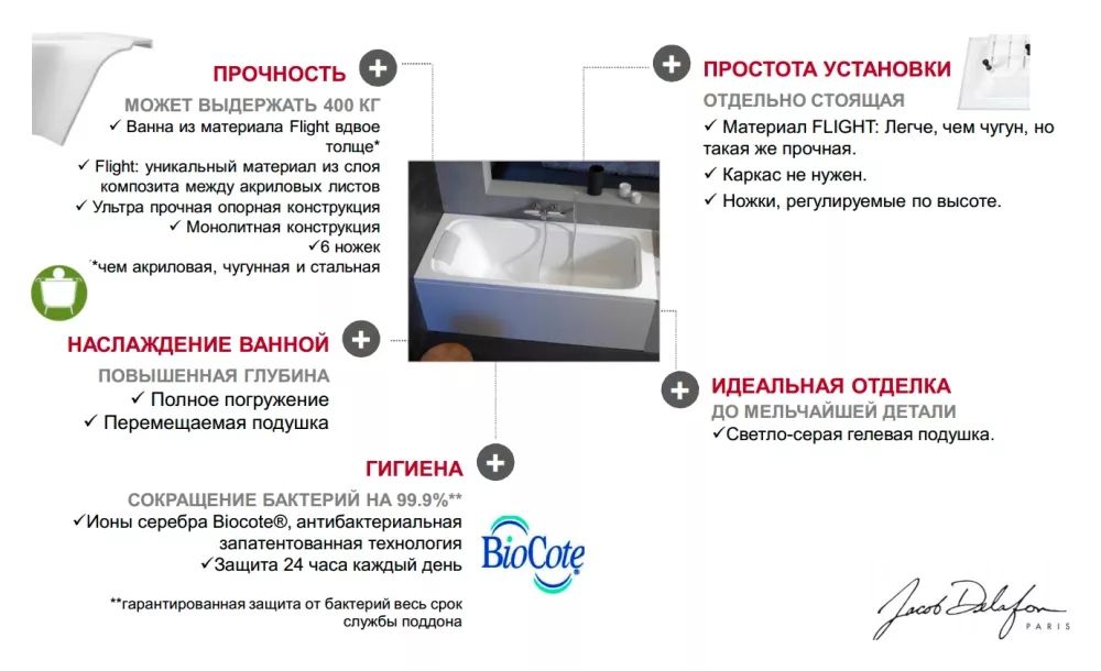 Ванна из искусственного камня Jacob Delafon 170 прямоугольная подкупает пользователя отличными эксплуатационными свойствами, показателями долговечности и прочности. Ванны отличаются следующими преимуществами: огромный ассортимент размеров и форм, простота монтажа, безопасность и комфорт. В отличие от природного материала, ванны из искусственного камня имеют небольшую теплоемкость, поэтому вода не так быстро остывает. Поверхность более приятная на ощупь, чем мраморная. Точно откалиброванная толщина стенок снижает шум при наборе воды. Высокая прочность конструкций позволяет установить ванны на штатные ножки без использования металлических каркасов и дополнительных крепежей в стену. Материал неприхотлив в уходе, не впитывает влагу, устойчив к химическим веществам и механическим повреждениям. Очистить ванну от налета и грязи можно с помощью бытовых чистящих средств и губки. Искусственный камень является диэлектриком и не проводит электрический ток. Большой выбор размеров, форм и цветовых решений позволит воплотить в реальность самые смелые и необычные дизайнерские идеи.